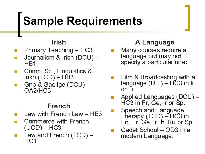 Sample Requirements Irish n n Primary Teaching – HC 3 Journalism & Irish (DCU) – HB 1 Comp. Sc. , Linguistics & Irish (TCD) – HB 3 Gno & Gaeilge (DCU) – OA 2/HC 3 A Language n Many courses require a language but may not specify a particular one: n Film & Broadcasting with a language (DIT) – HC 3 in Ir or Fr. Applied Languages (DCU) – HC 3 in Fr, Ge, Ir or Sp. Speech and Language Therapy (TCD) – HC 3 in En, Fr, Ge, Ir, It, Ru or Sp. Cadet School – OD 3 in a modern Language. n French n n n Law with French Law – HB 3 Commerce with French (UCD) – HC 3 Law and French (TCD) – HC 1 n n
