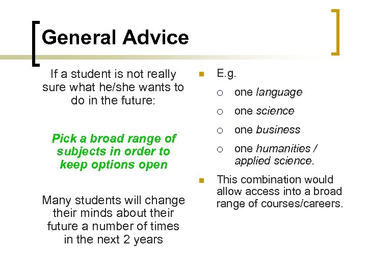 General Advice If a student is not really sure what he/she wants to do in the future: n E. g. ¡ ¡ Many students will change their minds about their future a number of times in the next 2 years one business ¡ n one science ¡ Pick a broad range of subjects in order to keep options open one language one humanities / applied science. This combination would allow access into a broad range of courses/careers.