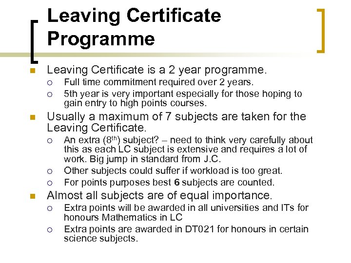 Leaving Certificate Programme n Leaving Certificate is a 2 year programme. ¡ ¡ n Usually a maximum of 7 subjects are taken for the Leaving Certificate. ¡ ¡ ¡ n Full time commitment required over 2 years. 5 th year is very important especially for those hoping to gain entry to high points courses. An extra (8 th) subject? – need to think very carefully about this as each LC subject is extensive and requires a lot of work. Big jump in standard from J. C. Other subjects could suffer if workload is too great. For points purposes best 6 subjects are counted. Almost all subjects are of equal importance. ¡ ¡ Extra points will be awarded in all universities and ITs for honours Mathematics in LC Extra points are awarded in DT 021 for honours in certain science subjects.