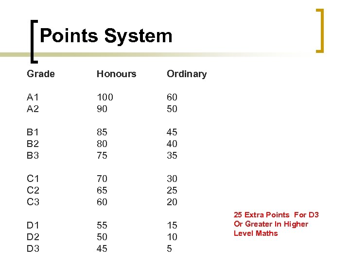 Points System Grade Honours Ordinary A 1 A 2 100 90 60 50 B 1 B 2 B 3 85 80 75 45 40 35 C 1 C 2 C 3 70 65 60 30 25 20 D 1 D 2 D 3 55 50 45 15 10 5 25 Extra Points For D 3 Or Greater In Higher Level Maths