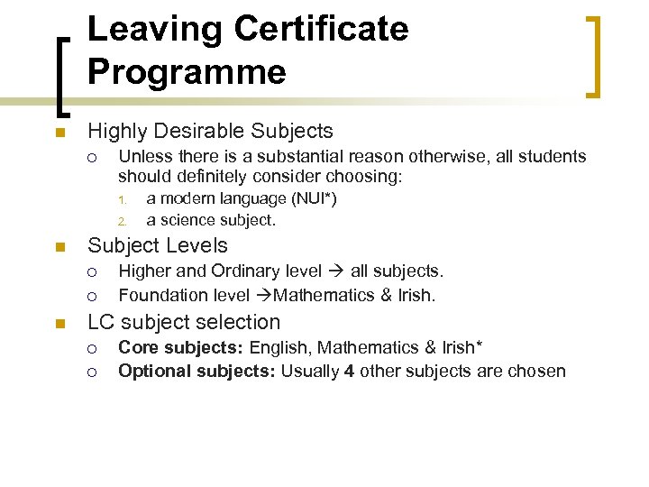 Leaving Certificate Programme n Highly Desirable Subjects ¡ Unless there is a substantial reason otherwise, all students should definitely consider choosing: 1. 2. n Subject Levels ¡ ¡ n a modern language (NUI*) a science subject. Higher and Ordinary level all subjects. Foundation level Mathematics & Irish. LC subject selection ¡ ¡ Core subjects: English, Mathematics & Irish* Optional subjects: Usually 4 other subjects are chosen