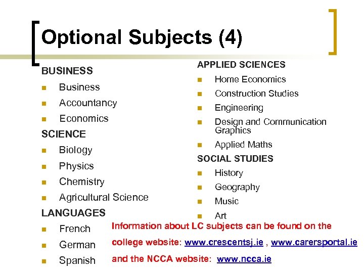 Optional Subjects (4) APPLIED SCIENCES BUSINESS n n Accountancy n Economics Construction Studies n Engineering Design and Communication Graphics n Business n n n Home Economics Applied Maths SCIENCE n Biology n Physics n Chemistry n Agricultural Science LANGUAGES SOCIAL STUDIES n History n Geography n Music n French Art Information about LC subjects can be found on the n German college website: www. crescentsj. ie , www. carersportal. ie n Spanish and the NCCA website: www. ncca. ie n