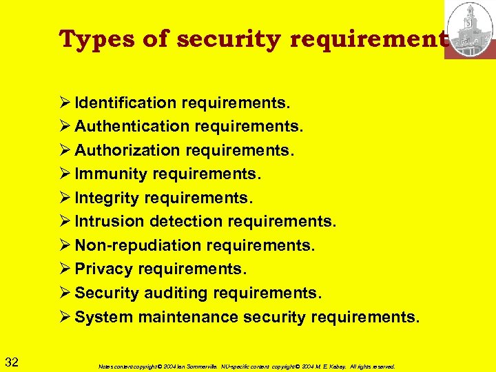 Types of security requirement Ø Identification requirements. Ø Authentication requirements. Ø Authorization requirements. Ø Immunity requirements. Ø Integrity requirements. Ø Intrusion detection requirements. Ø Non-repudiation requirements. Ø Privacy requirements. Ø Security auditing requirements. Ø System maintenance security requirements. 32 Notes content copyright © 2004 Ian Sommerville. NU-specific content copyright © 2004 M. E. Kabay. All rights reserved.