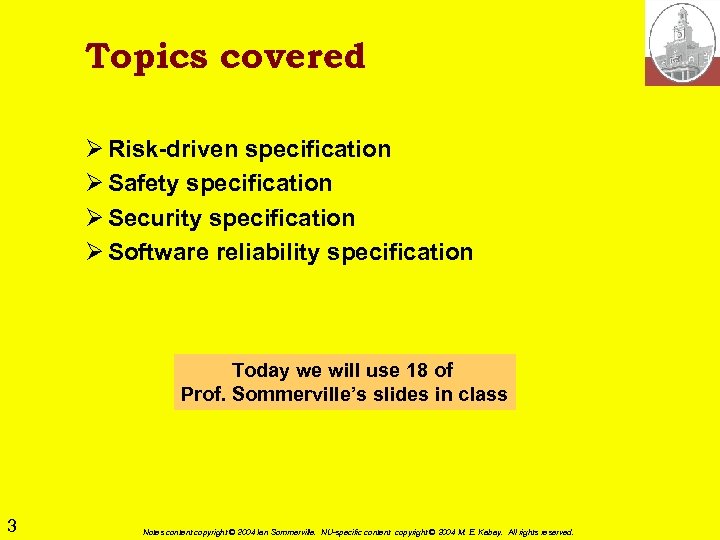 Topics covered Ø Risk-driven specification Ø Safety specification Ø Security specification Ø Software reliability specification Today we will use 18 of Prof. Sommerville’s slides in class 3 Notes content copyright © 2004 Ian Sommerville. NU-specific content copyright © 2004 M. E. Kabay. All rights reserved.