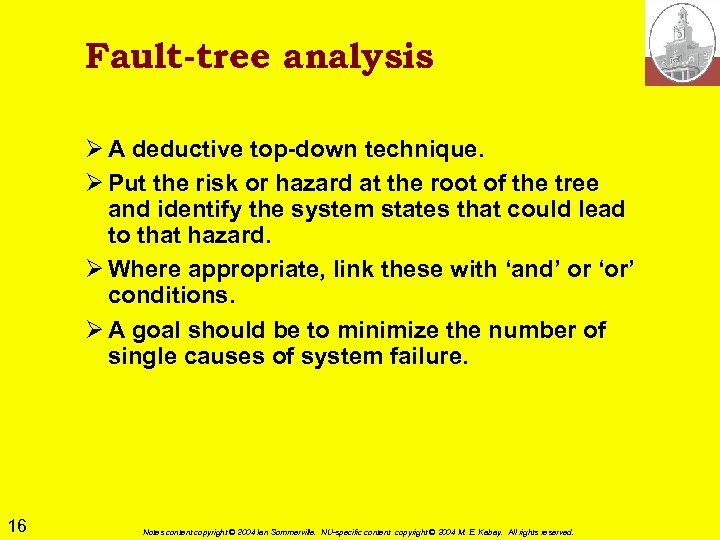 Fault-tree analysis Ø A deductive top-down technique. Ø Put the risk or hazard at the root of the tree and identify the system states that could lead to that hazard. Ø Where appropriate, link these with ‘and’ or ‘or’ conditions. Ø A goal should be to minimize the number of single causes of system failure. 16 Notes content copyright © 2004 Ian Sommerville. NU-specific content copyright © 2004 M. E. Kabay. All rights reserved.