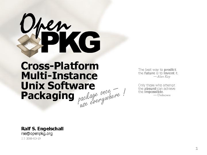 Cross-Platform Multi-Instance Unix Software ce — age roynwhere ! Packaging pack ve use e The best way to predict the future is to invent it. — Alan Kay Only those who attempt the absurd can achieve the impossible. — Unknown Ralf S. Engelschall rse@openpkg. org 2. 5 2006 -03 -19 1