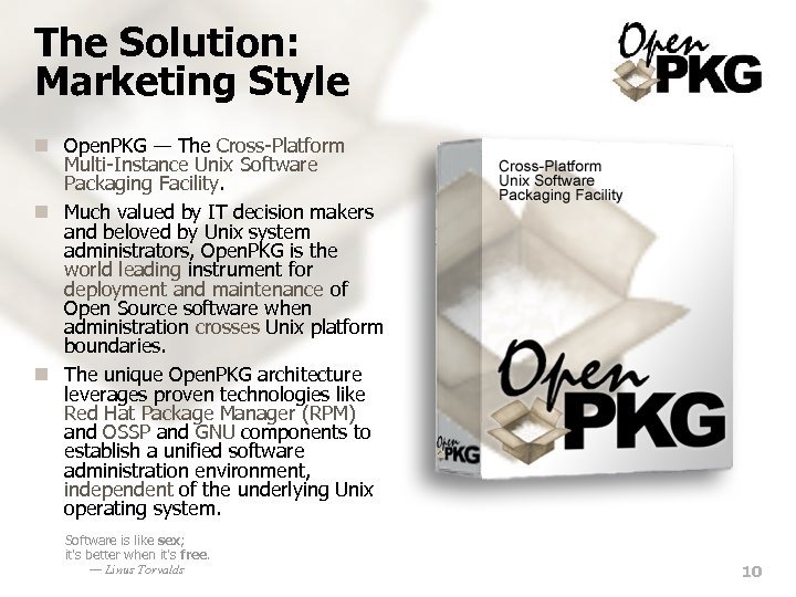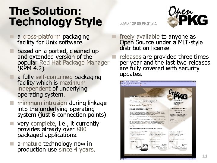 The Solution: Marketing Style n Open. PKG — The Cross-Platform Multi-Instance Unix Software Packaging Facility. n Much valued by IT decision makers and beloved by Unix system administrators, Open. PKG is the world leading instrument for deployment and maintenance of Open Source software when administration crosses Unix platform boundaries. n The unique Open. PKG architecture leverages proven technologies like Red Hat Package Manager (RPM) and OSSP and GNU components to establish a unified software administration environment, independent of the underlying Unix operating system. Software is like sex; it's better when it's free. — Linus Torvalds 10
