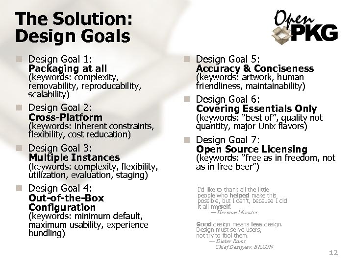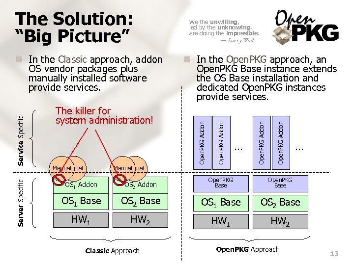 The Solution: Design Goals n Design Goal 1: Packaging at all (keywords: complexity, removability, reproducability, scalability) n Design Goal 2: Cross-Platform (keywords: inherent constraints, flexibility, cost reducation) n Design Goal 3: Multiple Instances (keywords: complexity, flexibility, utilization, evaluation, staging) n Design Goal 4: Out-of-the-Box Configuration (keywords: minimum default, maximum usability, experience bundling) n Design Goal 5: Accuracy & Conciseness (keywords: artwork, human friendliness, maintainability) n Design Goal 6: Covering Essentials Only (keywords: “best of”, quality not quantity, major Unix flavors) n Design Goal 7: Open Source Licensing (keywords: “free as in freedom, not as in free beer”) I'd like to thank all the little people who helped make this possible, but I can't, because I did it all myself. — Herman Monster Good design means less design. Design must serve users, not try to fool them. — Dieter Rams, Chief Designer, BRAUN 12