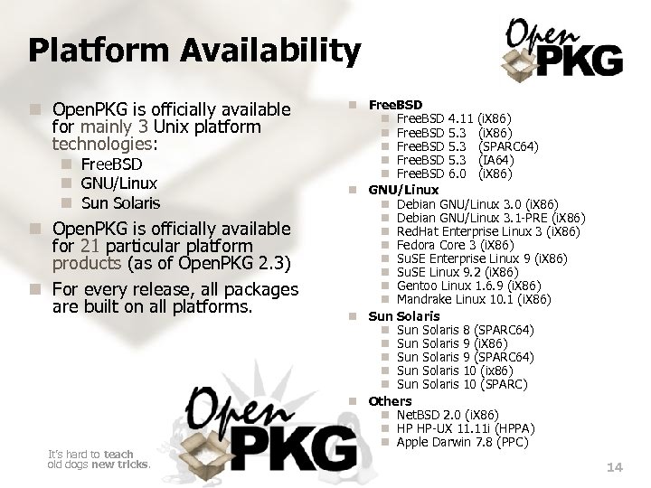 Server Specific Manual Open. PKG Addon . . . Open. PKG Addon The killer for system administration! n In the Open. PKG approach, an Open. PKG Base instance extends the OS Base installation and dedicated Open. PKG instances provide services. Open. PKG Addon Service Specific n In the Classic approach, addon OS vendor packages plus manually installed software provide services. We the unwilling, led by the unknowing, are doing the impossible. — Larry Wall Open. PKG Addon The Solution: “Big Picture” . . . Manual OS 1 Addon OS 2 Addon Open. PKG Base OS 1 Base OS 2 Base HW 1 HW 2 Classic Approach Open. PKG Approach 13