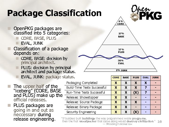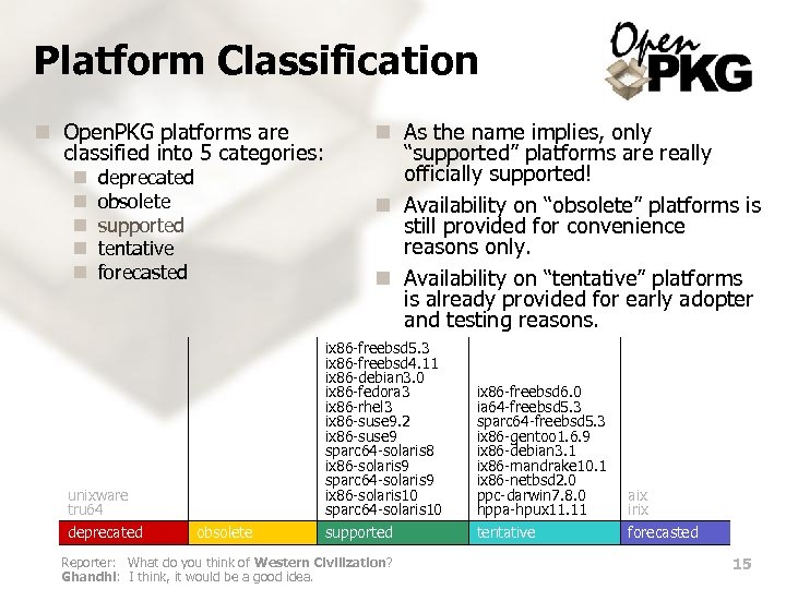 Platform Classification n Open. PKG platforms are classified into 5 categories: n n n deprecated obsolete supported tentative forecasted unixware tru 64 deprecated obsolete n As the name implies, only “supported” platforms are really officially supported! n Availability on “obsolete” platforms is still provided for convenience reasons only. n Availability on “tentative” platforms is already provided for early adopter and testing reasons. ix 86 -freebsd 5. 3 ix 86 -freebsd 4. 11 ix 86 -debian 3. 0 ix 86 -fedora 3 ix 86 -rhel 3 ix 86 -suse 9. 2 ix 86 -suse 9 sparc 64 -solaris 8 ix 86 -solaris 9 sparc 64 -solaris 9 ix 86 -solaris 10 sparc 64 -solaris 10 supported Reporter: What do you think of Western Civilization? Ghandhi: I think, it would be a good idea. ix 86 -freebsd 6. 0 ia 64 -freebsd 5. 3 sparc 64 -freebsd 5. 3 ix 86 -gentoo 1. 6. 9 ix 86 -debian 3. 1 ix 86 -mandrake 10. 1 ix 86 -netbsd 2. 0 ppc-darwin 7. 8. 0 hppa-hpux 11. 11 tentative aix irix forecasted 15