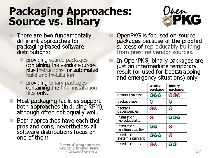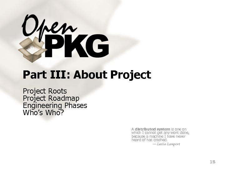 Packaging Approaches: Source vs. Binary n There are two fundamentally different approaches for packaging-based software distributions: n providing source packages containing the vendor sources plus instructions for automated build and installation. n providing binary packages containing the final installation files only. n Most packaging facilities support both approaches (including RPM), although often not equally well. n Both approaches have each their pros and cons, nevertheless all software distributions focus on one of them. Beware of programmers who carry screwdrivers. — Leonard Brandwein n Open. PKG is focused on source packages because of the proofed success of reproducably building from prestine vendor sources. n In Open. PKG, binary packages are just an intermediate temporary result (or used for bootstrapping and emergency situations) only. source package binary package installation reproducability installation run-time stability installation system alignment installation time distribution size package dependencies 17