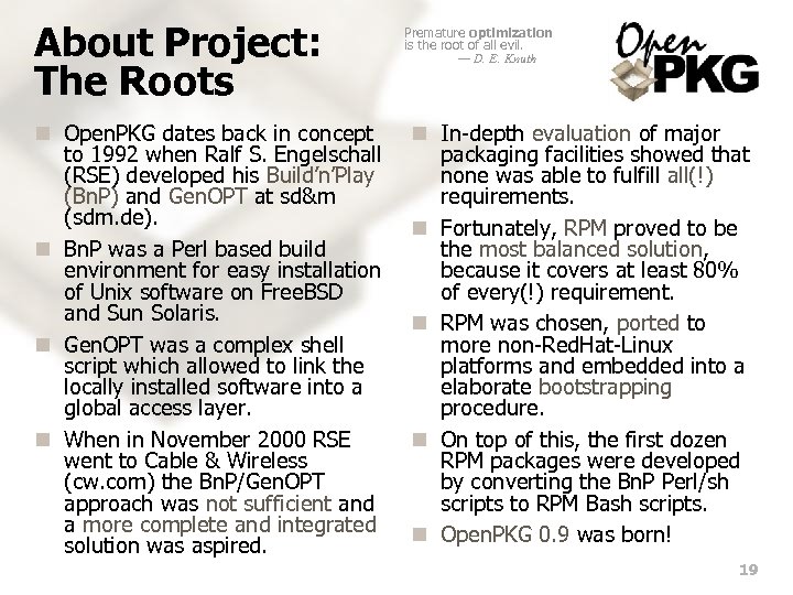 About Project: The Roots n Open. PKG dates back in concept to 1992 when Ralf S. Engelschall (RSE) developed his Build’n’Play (Bn. P) and Gen. OPT at sd&m (sdm. de). n Bn. P was a Perl based build environment for easy installation of Unix software on Free. BSD and Sun Solaris. n Gen. OPT was a complex shell script which allowed to link the locally installed software into a global access layer. n When in November 2000 RSE went to Cable & Wireless (cw. com) the Bn. P/Gen. OPT approach was not sufficient and a more complete and integrated solution was aspired. Premature optimization is the root of all evil. — D. E. Knuth n In-depth evaluation of major packaging facilities showed that none was able to fulfill all(!) requirements. n Fortunately, RPM proved to be the most balanced solution, because it covers at least 80% of every(!) requirement. n RPM was chosen, ported to more non-Red. Hat-Linux platforms and embedded into a elaborate bootstrapping procedure. n On top of this, the first dozen RPM packages were developed by converting the Bn. P Perl/sh scripts to RPM Bash scripts. n Open. PKG 0. 9 was born! 19