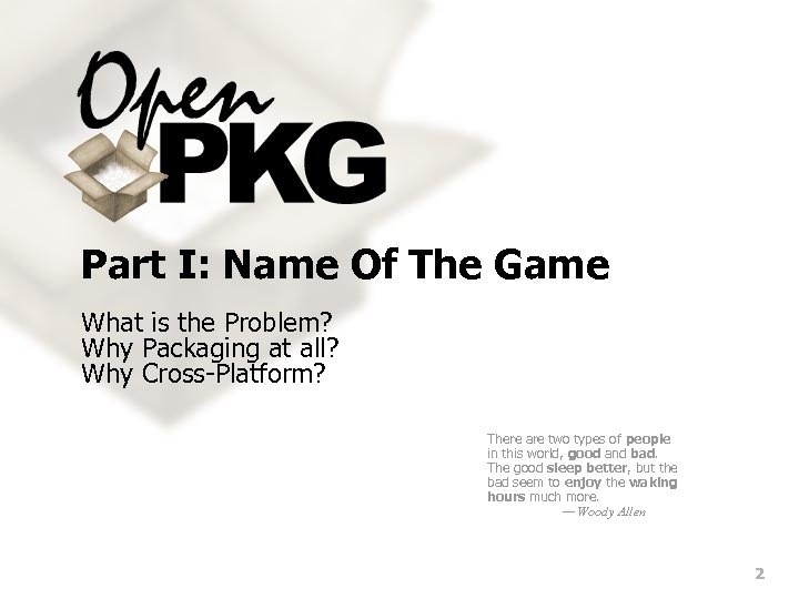 Part I: Name Of The Game What is the Problem? Why Packaging at all? Why Cross-Platform? There are two types of people in this world, good and bad. The good sleep better, but the bad seem to enjoy the waking hours much more. — Woody Allen 2