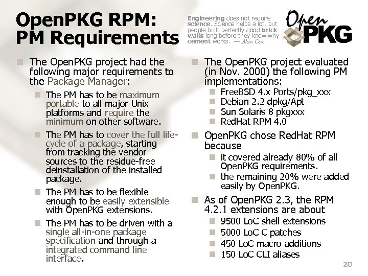Open. PKG RPM: PM Requirements n The Open. PKG project had the following major requirements to the Package Manager: n The PM has to be maximum portable to all major Unix platforms and require the minimum on other software. n The PM has to cover the full lifecycle of a package, starting from tracking the vendor sources to the residue-free deinstallation of the installed package. n The PM has to be flexible enough to be easily extensible with Open. PKG extensions. n The PM has to be driven with a single all-in-one package specification and through a integrated command line interface. Engineering does not require science. Science helps a lot, but people built perfectly good brick walls long before they knew why cement works. — Alan Cox n The Open. PKG project evaluated (in Nov. 2000) the following PM implementations: n n Free. BSD 4. x Ports/pkg_xxx Debian 2. 2 dpkg/Apt Sun Solaris 8 pkgxxx Red. Hat RPM 4. 0 n Open. PKG chose Red. Hat RPM because n it covered already 80% of all Open. PKG requirements. n the remaining 20% were added easily by Open. PKG. n As of Open. PKG 2. 3, the RPM 4. 2. 1 extensions are about n n 9500 Lo. C shell extensions 5000 Lo. C C patches 450 Lo. C macro additions 150 Lo. C CLI aliases 20