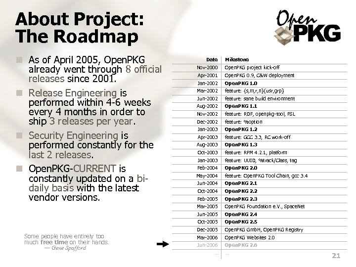 About Project: The Roadmap n As of April 2005, Open. PKG already went through 8 official releases since 2001. n Release Engineering is performed within 4 -6 weeks every 4 months in order to ship 3 releases per year. n Security Engineering is performed constantly for the last 2 releases. n Open. PKG-CURRENT is constantly updated on a bidaily basis with the latest vendor versions. Date Milestone Nov-2000 Open. PKG project kick-off Apr-2001 Open. PKG 0. 9, C&W deployment Jan-2002 Open. PKG 1. 0 Mar-2002 feature: {s, m, r, n}{usr, grp} Jun-2002 feature: sane build environment Aug-2002 Open. PKG 1. 1 Nov-2002 feature: RDF, openpkg-tool, FSL Dec-2002 feature: %option Jan-2003 Open. PKG 1. 2 Apr-2003 feature: GCC 3. 3, RC work-off Aug-2003 Open. PKG 1. 3 Oct-2003 feature: RPM 4. 2. 1, platform Jan-2003 feature: UUID, %track/Class, tag Feb-2004 Open. PKG 2. 0 May-2004 feature: Open. PKG Tool Chain, gcc 3. 4 Jun-2004 Open. PKG 2. 1 Oct-2004 Open. PKG 2. 2 Feb-2005 Open. PKG 2. 3 Mar-2005 Open. PKG Foundation e. V. , Space. Net Jun-2005 Open. PKG 2. 4 Oct-2005 Some people have entirely too much free time on their hands. — Gene Spafford Open. PKG 2. 5 Dec-2005 Open. PKG Gmb. H, Open. PKG Registry Mar-2006 Open. PKG Websites 2. 0 Jun-2006 Open. PKG 2. 6 . . . 21