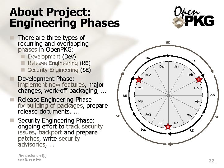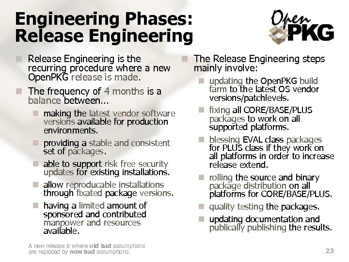 About Project: Engineering Phases n There are three types of recurring and overlapping phases in Open. PKG: SE n Development (Dev) n Release Engineering (RE) n Security Engineering (SE) n Development Phase: implement new features, major changes, work-off packaging, . . . n Release Engineering Phase: fix building of packages, prepare release documents, . . . n Security Engineering Phase: ongoing effort to track security issues, backport and prepare patches, write security advisories, . . . Recursive, adj. ; see Recursive. Dev RE Dec Jan Nov Feb R R Oct Mar Dev RE Sep SE Apr Aug May Jul Dev R SE Jun RE 22