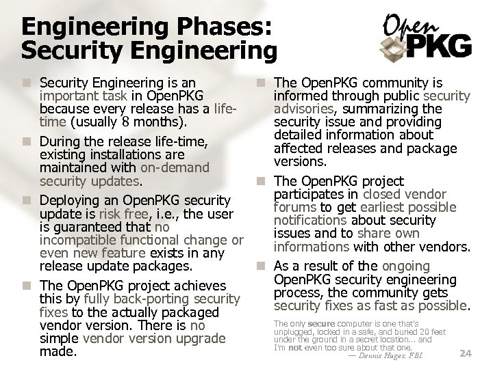 Engineering Phases: Security Engineering n Security Engineering is an n The Open. PKG community is important task in Open. PKG informed through public security because every release has a lifeadvisories, summarizing the time (usually 8 months). security issue and providing detailed information about n During the release life-time, affected releases and package existing installations are versions. maintained with on-demand security updates. n The Open. PKG project participates in closed vendor n Deploying an Open. PKG security forums to get earliest possible update is risk free, i. e. , the user notifications about security is guaranteed that no issues and to share own incompatible functional change or informations with other vendors. even new feature exists in any release update packages. n As a result of the ongoing Open. PKG security engineering n The Open. PKG project achieves process, the community gets this by fully back-porting security fixes as fast as possible. fixes to the actually packaged The only secure computer is one that's vendor version. There is no unplugged, locked in a safe, and buried 20 feet under the ground in a secret location. . . and simple vendor version upgrade I'm not even too sure about that one. made. 24 — Dennis Huges, FBI.