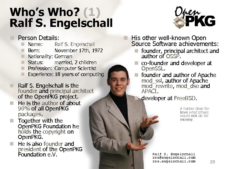 Who’s Who? (1) Ralf S. Engelschall n Person Details: n n n Name: Ralf S. Engelschall Born: November 17 th, 1972 Nationality: German Status: married, 2 children Profession: Computer Scientist Experience: 18 years of computing n Ralf S. Engelschall is the founder and principal architect of the Open. PKG project. n He is the author of about 90% of all Open. PKG packages. n Together with the Open. PKG Foundation he holds the copyright on Open. PKG. n He is also founder and president of the Open. PKG Foundation e. V. n His other well-known Open Source Software achievements: n founder, principal architect and author of OSSP. n co-founder and developer at Open. SSL. n founder and author of Apache mod_ssl, author of Apache mod_rewrite, mod_dso and APACI. n developer at Free. BSD. A hacker does for love what others would not do for money. Ralf S. Engelschall rse@engelschall. com rse. engelschall. com 25