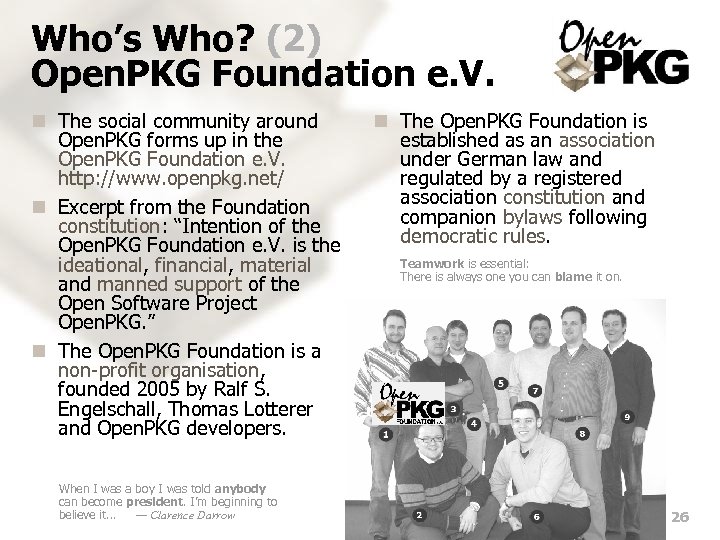Who’s Who? (2) Open. PKG Foundation e. V. n The social community around Open. PKG forms up in the Open. PKG Foundation e. V. http: //www. openpkg. net/ n Excerpt from the Foundation constitution: “Intention of the Open. PKG Foundation e. V. is the ideational, financial, material and manned support of the Open Software Project Open. PKG. ” n The Open. PKG Foundation is a non-profit organisation, founded 2005 by Ralf S. Engelschall, Thomas Lotterer and Open. PKG developers. When I was a boy I was told anybody can become president. I’m beginning to believe it. . . — Clarence Darrow n The Open. PKG Foundation is established as an association under German law and regulated by a registered association constitution and companion bylaws following democratic rules. Teamwork is essential: There is always one you can blame it on. 26