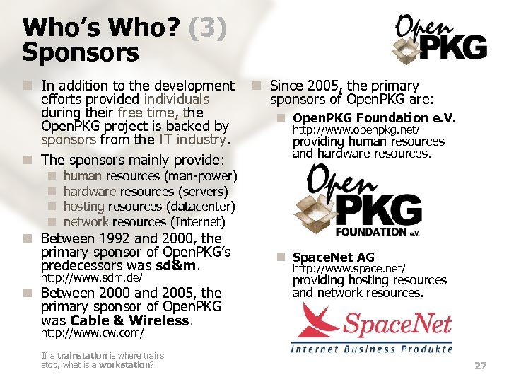 Who’s Who? (3) Sponsors n In addition to the development efforts provided individuals during their free time, the Open. PKG project is backed by sponsors from the IT industry. n The sponsors mainly provide: n n n Since 2005, the primary sponsors of Open. PKG are: n Open. PKG Foundation e. V. http: //www. openpkg. net/ providing human resources and hardware resources. human resources (man-power) hardware resources (servers) hosting resources (datacenter) network resources (Internet) n Between 1992 and 2000, the primary sponsor of Open. PKG’s predecessors was sd&m. http: //www. sdm. de/ n Between 2000 and 2005, the primary sponsor of Open. PKG was Cable & Wireless. n Space. Net AG http: //www. space. net/ providing hosting resources and network resources. http: //www. com/ If a trainstation is where trains stop, what is a workstation? 27