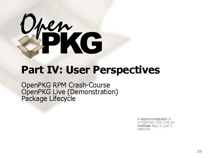 Part IV: User Perspectives Open. PKG RPM Crash-Course Open. PKG Live (Demonstration) Package Lifecycle A supercomputer is a machine, that runs an endless loop in just 2 seconds. 28