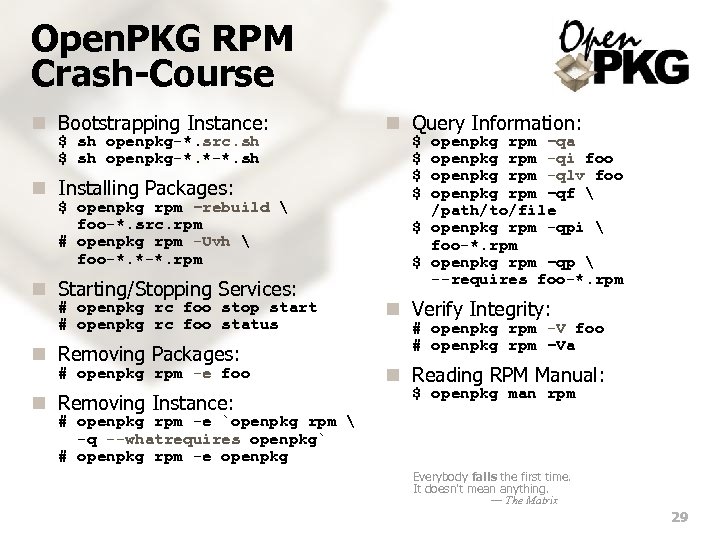 Open. PKG RPM Crash-Course n Bootstrapping Instance: $ sh openpkg-*. src. sh $ sh openpkg-*. *-*. sh n Installing Packages: $ openpkg rpm –rebuild foo-*. src. rpm # openpkg rpm -Uvh foo-*. *-*. rpm n Starting/Stopping Services: # openpkg rc foo stop start # openpkg rc foo status n Removing Packages: # openpkg rpm -e foo n Removing Instance: n Query Information: $ $ openpkg rpm –qa openpkg rpm -qi foo openpkg rpm -qlv foo openpkg rpm –qf /path/to/file $ openpkg rpm -qpi foo-*. rpm $ openpkg rpm –qp --requires foo-*. rpm n Verify Integrity: # openpkg rpm -V foo # openpkg rpm –Va n Reading RPM Manual: $ openpkg man rpm # openpkg rpm -e `openpkg rpm -q --whatrequires openpkg` # openpkg rpm -e openpkg Everybody falls the first time. It doesn't mean anything. — The Matrix 29