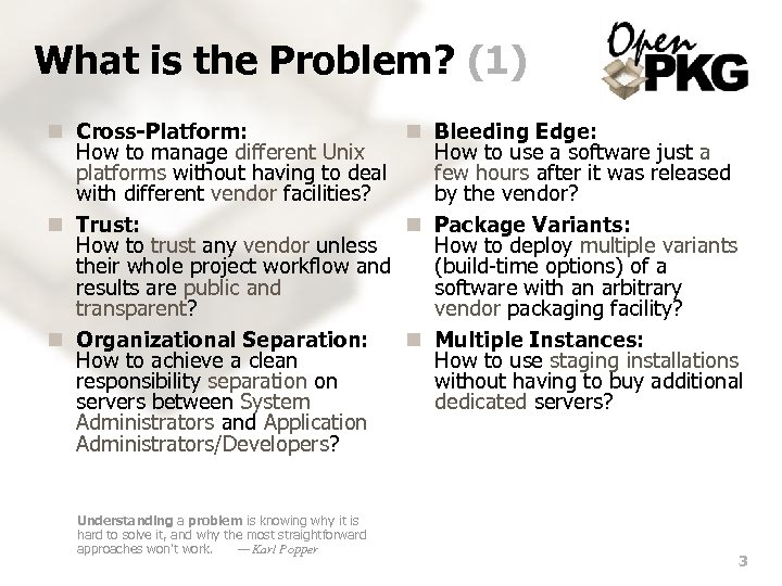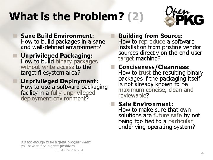 What is the Problem? (1) n Cross-Platform: n Bleeding Edge: How to manage different Unix How to use a software just a platforms without having to deal few hours after it was released with different vendor facilities? by the vendor? n Trust: n Package Variants: How to trust any vendor unless How to deploy multiple variants their whole project workflow and (build-time options) of a results are public and software with an arbitrary transparent? vendor packaging facility? n Organizational Separation: n Multiple Instances: How to achieve a clean How to use staging installations responsibility separation on without having to buy additional servers between System dedicated servers? Administrators and Application Administrators/Developers? Understanding a problem is knowing why it is hard to solve it, and why the most straightforward approaches won't work. — Karl Popper 3