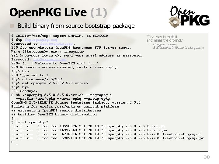 Open. PKG Live (1) n Build binary from source bootstrap package $ TMPDIR=/var/tmp; export TMPDIR ; cd $TMPDIR “The idea is to fall $ ftp. openpkg. org and miss the ground. ” Connected to ftp. openpkg. org. — Douglas Adams, 220 ftp. openpkg. org Open. PKG Anonymous FTP Server ready. A Hitchhiker's Guide to the galaxy. Name (ftp. openpkg. org): anonymous 331 Anonymous login ok, send your email address as password. Password: you@example. com 230 - [. . . ] Welcome to Open. PKG. org! [. . . ] 230 Anonymous access granted, restrictions apply. ftp> bin 200 Type set to I. ftp> cd release/2. 5/SRC ftp> get openpkg-2. 5. 0. src. sh ftp> bye 221 Goodbye. $ sh. /openpkg-2. 5. 0. src. sh --tag=opkg --prefix=/usr/opkg –-user=opkg –-group=opkg Open. PKG 2. 5 -RELEASE Source Bootstrap Package, version 2. 5. 0 Building for prefix /usr/opkg on current platform ++ extracting Open. PKG source distribution ++ building Open. PKG binary distribution [. . . ] $ ls –l openpkg-* -rw-r--r-- 1 foo 18558976 Oct 20 10: 20 openpkg-2. 5. 0. src. sh -rw-r--r-- 1 foo 16997568 Oct 20 10: 20 openpkg-2. 5. 0. src. rpm -rw-r--r-- 1 foo 6230016 Oct 20 10: 20 openpkg-2. 5. 0. ix 86 -freebsd 5. 4 -opkg. sh -rw-r--r-- 1 foo 5989118 Oct 20 10: 20 openpkg-2. 5. 0. ix 86 -freebsd 5. 4 -opkg. rpm $ _ 30
