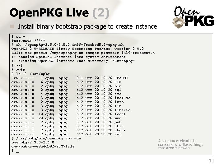 Open. PKG Live (2) n Install binary bootstrap package to create instance $ su – Password: ***** # sh. /openpkg-2. 5. 0. ix 86 -freebsd 5. 4 -opkg. sh Open. PKG 2. 5 -RELEASE Binary Bootstrap Package, version 2. 5. 0 Built for prefix /tmp/openpkg on target platform ix 86 -freebsd 5. 4 ++ hooking Open. PKG instance into system environment ++ creating Open. PKG instance root directory "/usr/opkg" [. . . ] # exit $ ls –l /usr/opkg -rw-r--r-1 opkg 911 Oct 20 10: 20 README drwxr-xr-x 6 opkg 512 Oct 20 10: 20 RPM drwxr-xr-x 2 opkg 512 Oct 20 10: 20 bin drwxr-xr-x 2 opkg 512 Oct 20 10: 20 cgi drwxr-xr-x 4 opkg 512 Oct 20 10: 20 etc drwxr-xr-x 3 opkg 512 Oct 20 10: 20 include drwxr-xr-x 2 opkg 512 Oct 20 10: 20 info drwxr-xr-x 3 opkg 512 Oct 20 10: 20 libexec drwxr-xr-x 10 opkg 512 Oct 20 10: 20 local drwxr-xr-x 20 opkg 512 Oct 20 10: 20 man drwxr-xr-x 2 opkg 512 Oct 20 10: 20 pub drwxr-xr-x 2 opkg 512 Oct 20 10: 20 sbin drwxr-xr-x 2 opkg 512 Oct 20 10: 20 share drwxr-xr-x 2 opkg 512 Oct 20 10: 20 var $ /usr/opkg/bin/openpkg rpm –qa A computer scientist is openpkg-2. 5. 0 someone who fixes things gpg-pubkey-63 c 4 cb 9 f-3 c 591 eda that aren't broken. $ _ 31