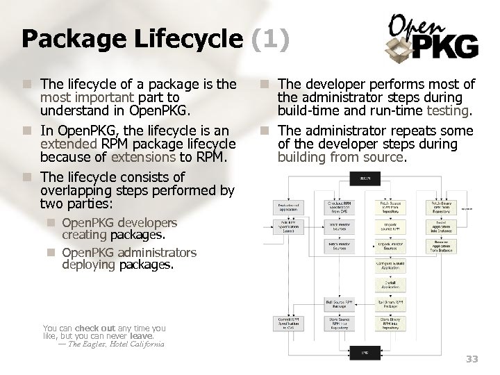 Package Lifecycle (1) n The lifecycle of a package is the most important part to understand in Open. PKG. n In Open. PKG, the lifecycle is an extended RPM package lifecycle because of extensions to RPM. n The lifecycle consists of overlapping steps performed by two parties: n The developer performs most of the administrator steps during build-time and run-time testing. n The administrator repeats some of the developer steps during building from source. n Open. PKG developers creating packages. n Open. PKG administrators deploying packages. You can check out any time you like, but you can never leave. — The Eagles, Hotel California 33