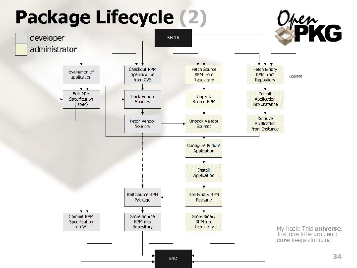 Package Lifecycle (2) developer administrator My hack: This universe. Just one little problem: core keeps dumping. 34
