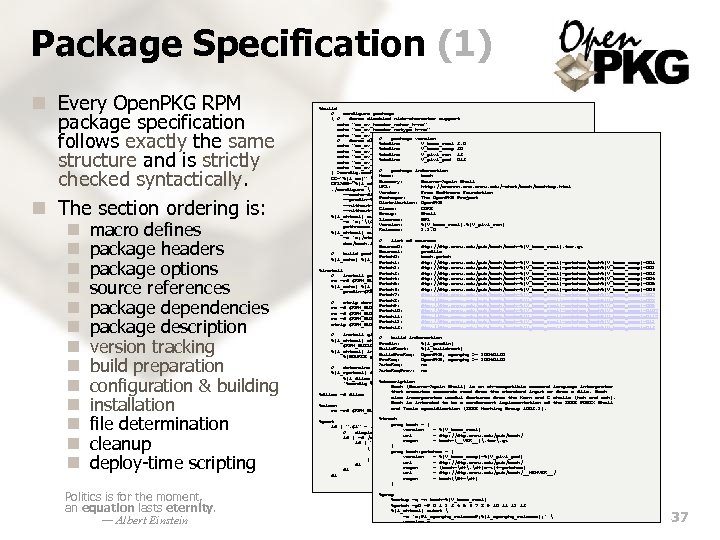 Package Specification (1) n Every Open. PKG RPM package specification follows exactly the same structure and is strictly checked syntactically. n The section ordering is: n n n n macro defines package headers package options source references package dependencies package description version tracking build preparation configuration & building installation file determination cleanup deploy-time scripting Politics is for the moment, an equation lasts eternity. — Albert Einstein %build # configure package ( # force disabled wide-character support echo "ac_cv_header_wchar_h=no" echo "ac_cv_header_wctype_h=no" echo "ac_cv_func_mbsrtowcs=no" # # force disabledpackage version internationalization support %define V_base_real 3. 0 echo "ac_cv_header_libintl_h=no" %define echo "ac_cv_func_gettext=no"V_base_comp 30 %define V_plvl_raw 13 echo "ac_cv_func_textdomain=no" %define V_plvl_pad 013 echo "ac_cv_func_bindtextdomain=no" echo "ac_cv_lib_intl_bindtextdomain=no" package information ) >config. cache # bash CC="%{l_cc}" Name: Summary: Bourne-Again Shell CFLAGS="%{l_cflags -O}" URL: http: //cnswww. cns. cwru. edu/~chet/bashtop. html. /configure Vendor: Free --cache-file=. /config. cache Software Foundation Packager: The Open. PKG Project --prefix=%{l_prefix} Distribution: Open. PKG --without-gnu-malloc Class: CORE --without-curses Group: Shell %{l_shtool} subst License: GPL -e 's; ^(#define. *SYS_PROFILE["^]*). *; 1 "%{l_prefix}/etc/bash/profile"; ' Version: %{V_base_real}. %{V_plvl_raw} pathnames. h Release: 2. 2. 0 %{l_shtool} subst -e 's; /etc/profile; %{l_prefix}/etc/bash/profile; ' list of sources doc/bash. 1 # Source 0: ftp: //ftp. cwru. edu/pub/bash-%{V_base_real}. tar. gz Source 1: profile # build package Patch 0: bash. patch %{l_make} %{l_mflags} Patch 1: ftp: //ftp. cwru. edu/pub/bash-%{V_base_real}-patches/bash%{V_base_comp}-001 Patch 2: ftp: //ftp. cwru. edu/pub/bash-%{V_base_real}-patches/bash%{V_base_comp}-002 %install Patch 3: ftp: //ftp. cwru. edu/pub/bash-%{V_base_real}-patches/bash%{V_base_comp}-003 # install package Patch 4: ftp: //ftp. cwru. edu/pub/bash-%{V_base_real}-patches/bash%{V_base_comp}-004 rm -rf $RPM_BUILD_ROOT Patch 5: ftp: //ftp. cwru. edu/pub/bash-%{V_base_real}-patches/bash%{V_base_comp}-005 %{l_make} %{l_mflags} install Patch 6: ftp: //ftp. cwru. edu/pub/bash-%{V_base_real}-patches/bash%{V_base_comp}-006 prefix=$RPM_BUILD_ROOT%{l_prefix} Patch 7: ftp: //ftp. cwru. edu/pub/bash-%{V_base_real}-patches/bash%{V_base_comp}-007 Patch 8: ftp: //ftp. cwru. edu/pub/bash-%{V_base_real}-patches/bash%{V_base_comp}-008 # strip down installation Patch 9: ftp: //ftp. cwru. edu/pub/bash-%{V_base_real}-patches/bash%{V_base_comp}-009 rm -f $RPM_BUILD_ROOT%{l_prefix}/info/dir Patch 10: ftp: //ftp. cwru. edu/pub/bash-%{V_base_real}-patches/bash%{V_base_comp}-0107 rm -f $RPM_BUILD_ROOT%{l_prefix}/man 1/bashbug. 1 Patch 11: ftp: //ftp. cwru. edu/pub/bash-%{V_base_real}-patches/bash%{V_base_comp}-0117 rm -f $RPM_BUILD_ROOT%{l_prefix}/bin/bashbug Patch 12: ftp: //ftp. cwru. edu/pub/bash-%{V_base_real}-patches/bash%{V_base_comp}-012 strip $RPM_BUILD_ROOT%{l_prefix}/bin/bash Patch 13: ftp: //ftp. cwru. edu/pub/bash-%{V_base_real}-patches/bash%{V_base_comp}-013 # install global configuration # %{l_shtool} mkdir -fbuild information -p -m 755 Prefix: %{l_prefix} $RPM_BUILD_ROOT%{l_prefix}/etc/bash Build. Root: %{l_shtool} install -c -m 644 %{l_buildroot} %{l_value -s -a} Build. Pre. Req: Open. PKG, openpkg >= 20040130 %{SOURCE profile} $RPM_BUILD_ROOT%{l_prefix}/etc/bash/ Pre. Req: Open. PKG, openpkg >= 20040130 Auto. Req: no # determine installation files Auto. Req. Prov: -r$RPM_BUILD_ROOT %{l_rpmtool} files -v -ofiles no %{l_files_std} %description '%config %{l_prefix}/etc/bash/profile' Bash (Bourne-Again Shell) is an sh-compatible command language interpreter that executes commands read from the standard input or from a file. Bash %files -f files also incorporates useful features from the Korn and C shells (ksh and csh). Bash is intended to be a conformant implementation of the IEEE POSIX Shell %clean and rm -rf $RPM_BUILD_ROOT Tools specification (IEEE Working Group 1003. 2). %track %post prog if [ ". $1" =. 1 ]; then bash = { version = %{V_base_real} # display note about login shell prerequisite url = ftp: //ftp. cwru. edu/pub/bash/ if [ -f /etc/shells ]; then regex = bash-(__VER__). tar. gz if [ ". `grep $RPM_INSTALL_PREFIX/bin/bash /etc/shells`" =. ]; then } ( echo "Hint: To use $RPM_INSTALL_PREFIX/bin/bash as the login" prog for users, = { echo "shellbash: patchesplease add this path to /etc/shells. " version = -t notice ) | %{l_rpmtool} msg -b %{V_base_comp}-%{V_plvl_pad} url = ftp: //ftp. cwru. edu/pub/bash/ fi regex = (bash-d+. d+[a-z]+-patches) fi url = ftp: //ftp. cwru. edu/pub/bash/__NEWVER__/ fi regex = bash(S+-d+) } %prep %setup -q -n bash-%{V_base_real} %patch -p 0 -P 0 1 2 3 4 5 6 7 8 9 10 11 12 13 %{l_shtool} subst -e 's; @l_openpkg_release@; %{l_openpkg_release}; ' version. c 37