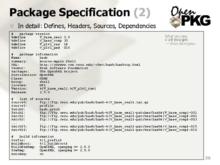 Package Specification (2) n In detail: Defines, Headers, Sources, Dependencies # package version %define V_base_real %define V_base_comp %define V_plvl_raw %define V_plvl_pad 3. 0 30 16 016 What you see is all you get. — Brian Kernighan # package information Name: bash Summary: Bourne-Again Shell URL: http: //cnswww. cns. cwru. edu/~chet/bashtop. html Vendor: Free Software Foundation Packager: The Open. PKG Project Distribution: Open. PKG Class: CORE Group: Shell License: GPL Version: %{V_base_real}. %{V_plvl_raw} Release: 2. 5. 0 # list of sources Source 0: ftp: //ftp. cwru. edu/pub/bash-%{V_base_real}. tar. gz Source 1: profile Patch 0: bash. patch Patch 1: ftp: //ftp. cwru. edu/pub/bash-%{V_base_real}-patches/bash%{V_base_comp}-001 Patch 2: ftp: //ftp. cwru. edu/pub/bash-%{V_base_real}-patches/bash%{V_base_comp}-002 Patch 3: ftp: //ftp. cwru. edu/pub/bash-%{V_base_real}-patches/bash%{V_base_comp}-003. . . Patch 15: ftp: //ftp. cwru. edu/pub/bash-%{V_base_real}-patches/bash%{V_base_comp}-015 Patch 16: ftp: //ftp. cwru. edu/pub/bash-%{V_base_real}-patches/bash%{V_base_comp}-016 # build information Prefix: %{l_prefix} Build. Root: %{l_buildroot} Build. Pre. Req: Open. PKG, openpkg >= 2. 5. 0 Auto. Req: no 38