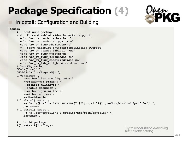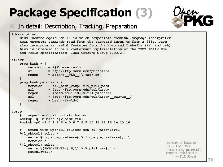 Package Specification (3) n In detail: Description, Tracking, Preparation %description Bash (Bourne-Again Shell) is an sh-compatible command language interpreter that executes commands read from the standard input or from a file. Bash also incorporates useful features from the Korn and C shells (ksh and csh). Bash is intended to be a conformant implementation of the IEEE POSIX Shell and Tools specification (IEEE Working Group 1003. 2). %track prog bash = { version = %{V_base_real} url = ftp: //ftp. cwru. edu/pub/bash/ regex = bash-(__VER__). tar. gz } prog bash: patches = { version = %{V_base_comp}-%{V_plvl_pad} url = ftp: //ftp. cwru. edu/pub/bash/ regex = (bash-d+. d+[a-z]+-patches) url = ftp: //ftp. cwru. edu/pub/bash/__NEWVER__/ regex = bash(S+-d+) } %prep # unpack and patch distribution %setup -q -n bash-%{V_base_real} %patch -p 0 -P 0 1 2 3 4 5 6 7 8 9 10 11 12 13 14 15 16 # brand with Open. PKG release and fix patchlevel %{l_shtool} subst -e 's; @l_openpkg_release@; %{l_openpkg_release}; ' version. c %{l_shtool} subst -e 's; (PATCHLEVEL) 0; 1 %{V_plvl_raw}; ' patchlevel. h Beware of bugs in the above code; I have only proved it correct, not tried it. — D. E. Knuth 39