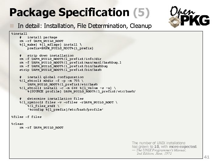 Package Specification (4) n In detail: Configuration and Building %build # configure package ( # force disabled wide-character support echo "ac_cv_header_wchar_h=no" echo "ac_cv_header_wctype_h=no" echo "ac_cv_func_mbsrtowcs=no" # force disabled internationalization support echo "ac_cv_header_libintl_h=no" echo "ac_cv_func_gettext=no" echo "ac_cv_func_textdomain=no" echo "ac_cv_func_bindtextdomain=no" echo "ac_cv_lib_intl_bindtextdomain=no" ) >config. cache CC="%{l_cc}" CFLAGS="%{l_cflags -O}" . /configure --cache-file=. /config. cache --prefix=%{l_prefix} --disable-multibyte --enable-debugger --without-gnu-malloc --without-curses --disable-nls %{l_shtool} subst -e 's; ^(#define. *SYS_PROFILE["^]*). *; 1 " %{l_prefix}/etc/bash/profile"; ' pathnames. h %{l_shtool} subst -e 's; /etc/profile; %{l_prefix}/etc/bash/profile; ' doc/bash. 1 # build package %{l_make} %{l_mflags} Try to understand everything, but believe nothing! 40
