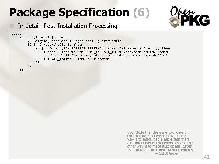 Package Specification (6) n In detail: Post-Installation Processing %post if [ ". $1" =. 1 ]; then # display note about login shell prerequisite if [ -f /etc/shells ]; then if [ ". `grep $RPM_INSTALL_PREFIX/bin/bash /etc/shells`" =. ]; then ( echo "Hint: To use $RPM_INSTALL_PREFIX/bin/bash as the login" echo "shell for users, please add this path to /etc/shells. " ) | %{l_rpmtool} msg -b -t notice fi fi fi I conclude that there are two ways of constructing a software design: One way is to make it so simple that there are obviously no deficiencies and the other way is to make it so complicated that there are no obvious deficiencies. — C. A. R. Hoare 42