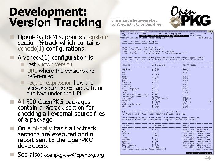 Development: Version Tracking Life is just a beta-version. Don't expect it to be bug-free. n Open. PKG RPM supports a custom section %track which contains vcheck(1) configurations. n A vcheck(1) configuration is: n last known version n URL where the versions are referenced n regular expression how the versions can be extracted from the text under the URL n All 800 Open. PKG packages contain a %track section for checking all external source files of a package. n On a bi-daily basis all %track sections are executed and a report sent to the Open. PKG developers. n See also: openpkg-dev@openpkg. org 44