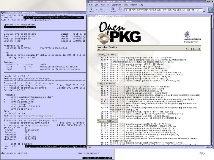 Development: CVS Repository n All sources of Open. PKG are stored in a central CVS based repository system. n Every “Commit” to the repository is real-time tracked both with detailed reports via Email and on-line via CVSTrac. n Every Open. PKG release is an own “branch” in the repository. n See also: http: //cvs. openpkg. org/ openpkg-cvs@openpkg. org Murphy's Law is recursive: Washing your car to make it rain doesn't work. 45