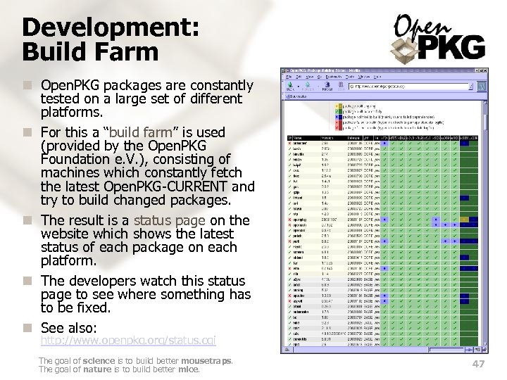 Development: Build Farm n Open. PKG packages are constantly tested on a large set of different platforms. n For this a “build farm” is used (provided by the Open. PKG Foundation e. V. ), consisting of machines which constantly fetch the latest Open. PKG-CURRENT and try to build changed packages. n The result is a status page on the website which shows the latest status of each package on each platform. n The developers watch this status page to see where something has to be fixed. n See also: http: //www. openpkg. org/status. cgi The goal of science is to build better mousetraps. The goal of nature is to build better mice. 47