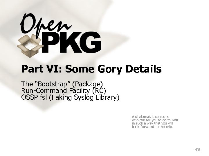 Part VI: Some Gory Details The “Bootstrap” (Package) Run-Command Facility (RC) OSSP fsl (Faking Syslog Library) A diplomat is someone who can tell you to go to hell in such a way that you will look forward to the trip. 48