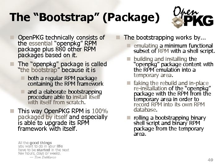 The “Bootstrap” (Package) n Open. PKG technically consists of the essential “openpkg” RPM package plus 880 other RPM packages based on it. n The “openpkg” package is called “the bootstrap” because it is n both a regular RPM package containing the RPM framework n and a elaborate bootstrapping procedure able to install itself with itself from scratch. n This way Open. PKG RPM is 100% packaged by itself and especially is able to upgrade its RPM framework with itself. All the good things you want to do in your life have to be started in the next few hours, days or weeks. — Tom De. Marco n The bootstrapping works by. . . n emulating a minimum functional subset of RPM with a shell script. n building and installing the “openpkg” package content with the RPM emulation into a temporary area. n faking the rebuild and in-place re-installation of the “openpkg” package with the RPM from the temporary area in order to record RPM into its own RPM database. n rolling a bootstrapping binary shell script and binary RPM package from the temporary area. 49