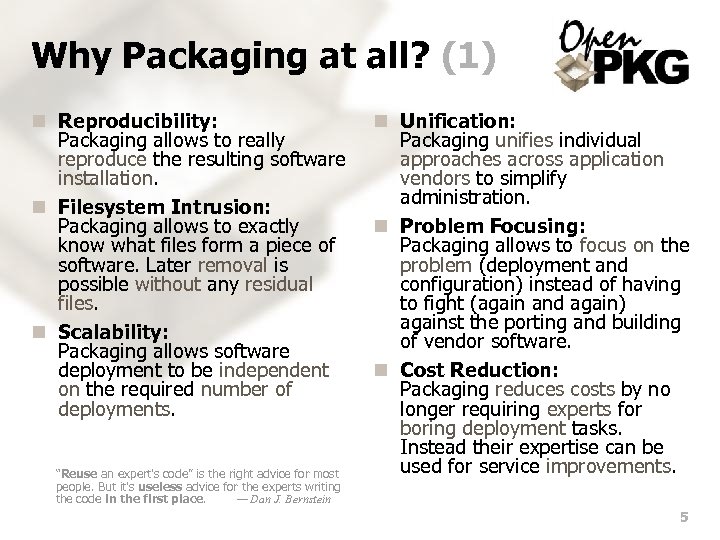 What is the Problem? (2) n Sane Build Environment: n Building from Source: How to build packages in a sane How to reproduce a software and well-defined environment? installation from pristine vendor sources directly on the end-user n Unprivileged Packaging: target machine? How to build binary packages without write access to the n Conciseness/Cleanness: target filesystem area? How to trust the resulting binary packages if the packaging itself n Unprivileged Deployment: is not already known to be How to use a software packaging maximum concise, clean and facility in a fully unprivileged reviewable? deployment environment? n Safe Environment: How to make sure that own solutions are future safe by not being too tied to a particular underlying operating system? It's not enough to be a great programmer; you have to find a great problem. — Charles Simonyi 4