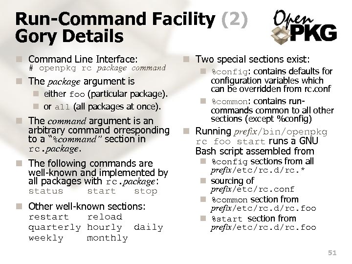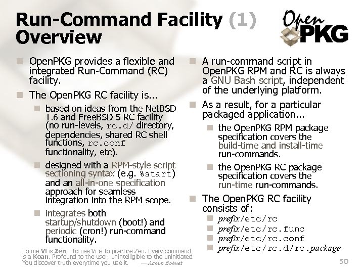 Run-Command Facility (1) Overview n Open. PKG provides a flexible and integrated Run-Command (RC) facility. n The Open. PKG RC facility is. . . n based on ideas from the Net. BSD 1. 6 and Free. BSD 5 RC facility (no run-levels, rc. d/ directory, dependencies, shared RC shell functions, rc. conf functionality, etc). n designed with a RPM-style script sectioning syntax (e. g. %start) and an all-in-one specification approach for seamless integration into the RPM scope. n integrates both startup/shutdown (boot!) and periodic (cron!) run-command functionality. n A run-command script in Open. PKG RPM and RC is always a GNU Bash script, independent of the underlying platform. n As a result, for a particular packaged application. . . n the Open. PKG RPM package specification covers the build-time and install-time run-commands. n the Open. PKG RC package specification covers the run-time run-commands. n The Open. PKG RC facility consists of: To me Vi is Zen. To use Vi is to practice Zen. Every command is a Koan. Profound to the user, unintelligible to the uninitiated. You discover truth everytime you use it. — Achim Bohnet n n prefix/etc/rc. func prefix/etc/rc. conf prefix/etc/rc. d/rc. package 50