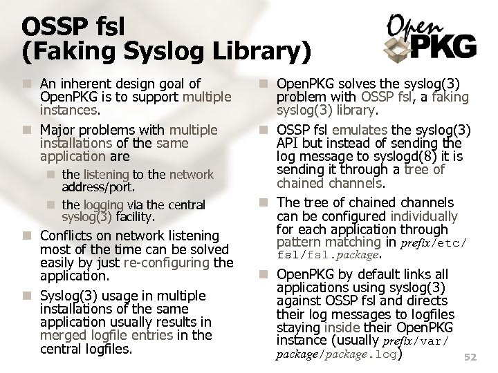 OSSP fsl (Faking Syslog Library) n An inherent design goal of Open. PKG is to support multiple instances. n Major problems with multiple installations of the same application are n the listening to the network address/port. n the logging via the central syslog(3) facility. n Conflicts on network listening most of the time can be solved easily by just re-configuring the application. n Syslog(3) usage in multiple installations of the same application usually results in merged logfile entries in the central logfiles. n Open. PKG solves the syslog(3) problem with OSSP fsl, a faking syslog(3) library. n OSSP fsl emulates the syslog(3) API but instead of sending the log message to syslogd(8) it is sending it through a tree of chained channels. n The tree of chained channels can be configured individually for each application through pattern matching in prefix/etc/ fsl/fsl. package. n Open. PKG by default links all applications using syslog(3) against OSSP fsl and directs their log messages to logfiles staying inside their Open. PKG instance (usually prefix/var/ package/package. log) 52