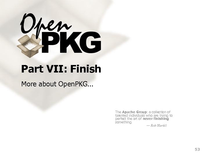 Part VII: Finish More about Open. PKG. . . The Apache Group: a collection of talented individuals who are trying to perfect the art of never finishing something. — Rob Hartill 53