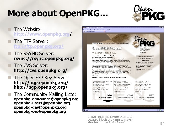 More about Open. PKG. . . n The Website: http: //www. openpkg. org/ n The FTP Server: ftp: //ftp. openpkg. org/ n The RSYNC Server: rsync: //rsync. openpkg. org/ n The CVS Server: http: //cvs. openpkg. org/ n The Open. PGP Key Server: http: //pgp. openpkg. org/ hkp: //pgp. openpkg. org/ n The Community Mailing Lists: openpkg-announce@openpkg. org openpkg-users@openpkg. org openpkg-dev@openpkg. org openpkg-cvs@openpkg. org I have made this longer than usual because I lack the time to make it shorter. — Blaise Pascal 54