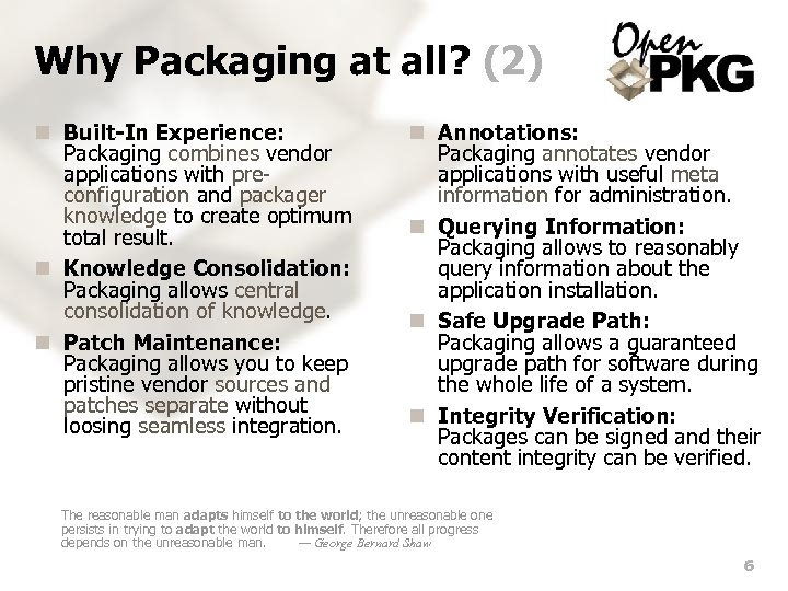 Why Packaging at all? (1) n Reproducibility: Packaging allows to really reproduce the resulting software installation. n Filesystem Intrusion: Packaging allows to exactly know what files form a piece of software. Later removal is possible without any residual files. n Scalability: Packaging allows software deployment to be independent on the required number of deployments. “Reuse an expert's code” is the right advice for most people. But it's useless advice for the experts writing the code in the first place. — Dan J. Bernstein n Unification: Packaging unifies individual approaches across application vendors to simplify administration. n Problem Focusing: Packaging allows to focus on the problem (deployment and configuration) instead of having to fight (again and again) against the porting and building of vendor software. n Cost Reduction: Packaging reduces costs by no longer requiring experts for boring deployment tasks. Instead their expertise can be used for service improvements. 5
