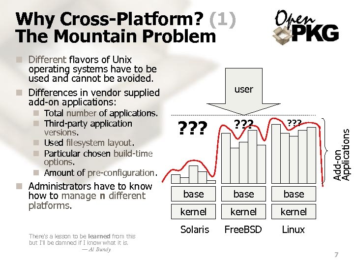 Why Packaging at all? (2) n Built-In Experience: Packaging combines vendor applications with preconfiguration and packager knowledge to create optimum total result. n Knowledge Consolidation: Packaging allows central consolidation of knowledge. n Patch Maintenance: Packaging allows you to keep pristine vendor sources and patches separate without loosing seamless integration. n Annotations: Packaging annotates vendor applications with useful meta information for administration. n Querying Information: Packaging allows to reasonably query information about the application installation. n Safe Upgrade Path: Packaging allows a guaranteed upgrade path for software during the whole life of a system. n Integrity Verification: Packages can be signed and their content integrity can be verified. The reasonable man adapts himself to the world; the unreasonable one persists in trying to adapt the world to himself. Therefore all progress depends on the unreasonable man. — George Bernard Shaw 6