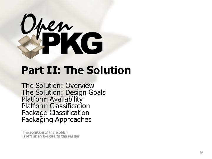 Part II: The Solution: Overview The Solution: Design Goals Platform Availability Platform Classification Package Classification Packaging Approaches The solution of this problem is left as an exercise to the reader. 9
