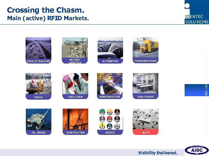 Crossing the Chasm. Main (active) RFID Markets. VEHICLE TRACKING MILITARY LOGISTICS AUTOMOTIVE TRANSPORTATION PORTS COOL CHAIN SEMICONDUCTOR HEALTHCARE OIL, MINING CONSTRUCTION SPORTS NEXT? Visibility Delivered. AIDC Strategic RFID Workshop 2009 / © IDENTEC SOLUTIONS AG 10